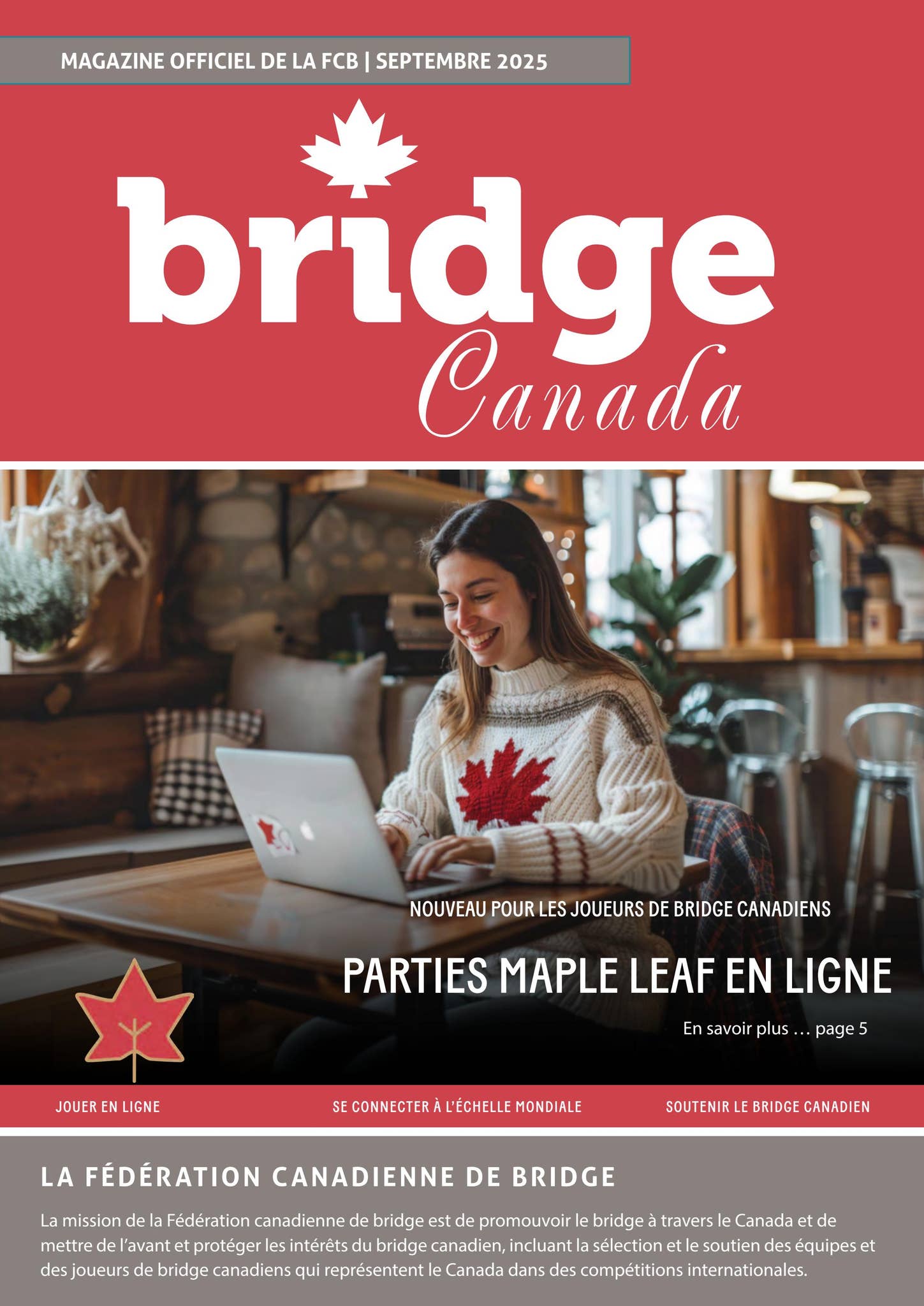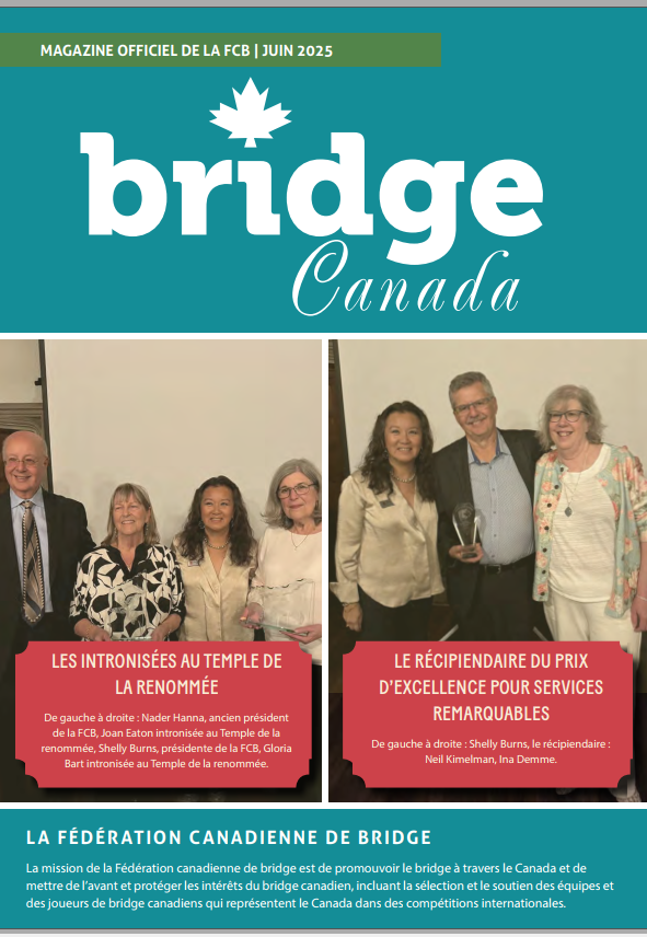 Le magazine Bridge Canada est maintenant disponible à toutes et à tous. Toutefois, si vous n’êtes pas membre de la FCB, nous vous invitons à y adhérer pour contribuer à la poursuite de la production du magazine et aux diverses activités de la FCB. Pour adhérer, cliquez sur le bouton rouge «Joindre la FCB» sur la page principale, ou allez au menu «Membres», et complétez le formulaire. Les frais d’adhésion sont seulement 25$ par année, 65$ pour 3 ans.