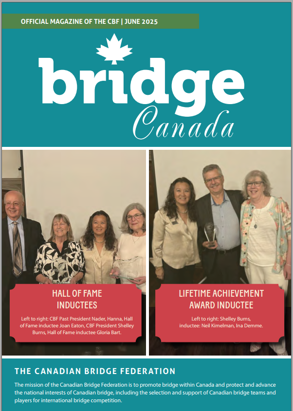 Bridge Canada is the CBF’s official magazine, published 4 times a year, in digital format. It features articles written by Canadian bridge players for players of all levels, analysis and commentary from experts at the Great Canadian Bidding Contest, and information on bridge events.